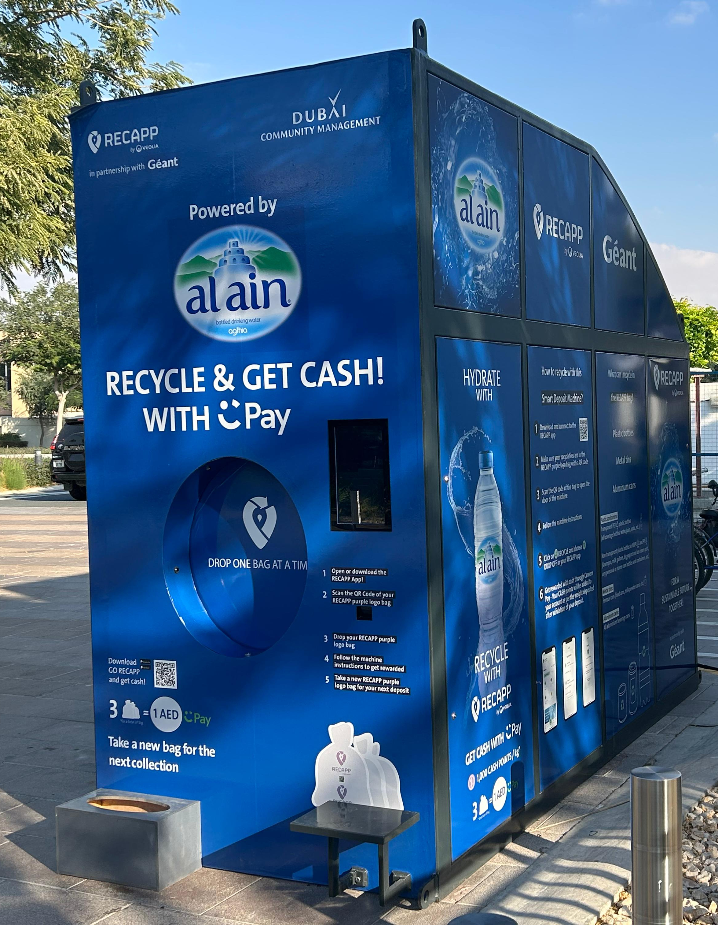 Find our RECAPP Smart Deposit Machines, Smart Recycling Stations, Reverse Vending Machines and even Smart boxes in different areas in Dubai and Abu Dhabi. Enjoy a FREE alternative solution to the paid Door-to-door collection! Keep get rewarded with our RVM and Smart Boxes = 20 bottles is equivalent to 1 AED with our Reward Partner Al Ain Water!! And get even more with our Smart Deposit Machines and Smart Recycling Stations = 5 kg is equivalent to 1 AED with our partner Careem Pay!!! Find the locations on our Recycling Map below and dispose of your RECAPP bags in it to earn more RECAPP points.